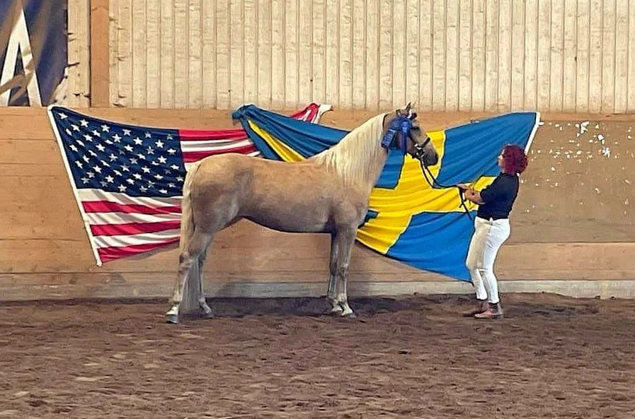 This is Island Centavo an buckskin colored morgan horse whom is so darken by the sooty in his color that he almost look black. He lived at the Escania morgans Thorells Spring Breeze is a red flaxen morgan gelding with owner Lotta Bjørnstrøm in Sweden