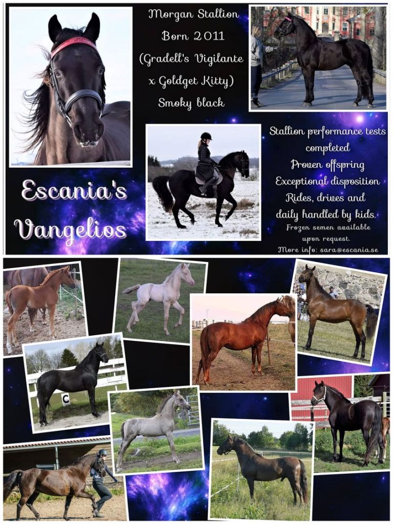 Escanias Vangelios is a black morgan horse with one hidden creamgene he lives at Escanias in Sweden and he is also Lunas father